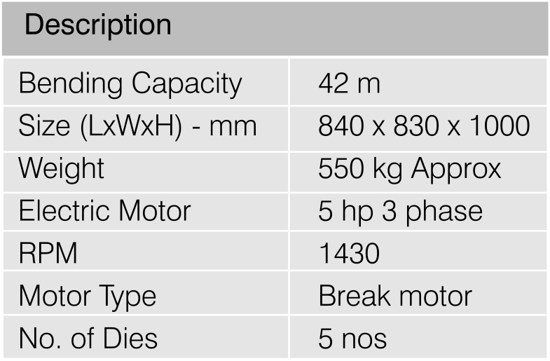 Tejus Centering is a trusted manufacturer and supplier of high-quality Bar Bending Machines in India. Our machines feature hardened steel gears and superior branded electrical components for enhanced durability and performance. Equipped with an electrical braking system and proper limit switches, they ensure safety and precision during operation. Each machine comes with a complete circuit diagram, facilitating easy on-site maintenance. With a bending capacity of 42 mm, powered by a 5 HP Crompton Greaves 3-phase motor running at 1430 RPM, and equipped with 5 dies, our Bar Bending Machines are designed to meet the demanding needs of construction projects efficiently and reliably.